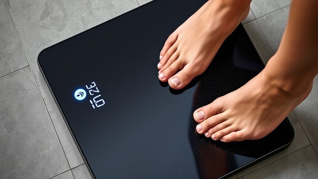 Smart scales guarantee accurate body composition measurements by using bioelectrical impedance analysis (BIA), where a tiny electrical current passes through your body. I find that consistent placement on the scale and proper hydration levels are key for reliable results. The scale’s sensors detect resistance to the current, calculating muscle, fat, and water percentages. Regular use and calibration help me track progress accurately over time.