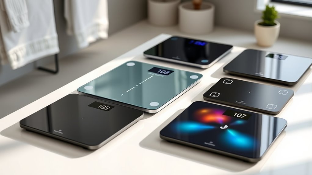 Managing user profiles effectively is essential for getting accurate body composition data from your smart scale. Multiple user profile management lets the scale recognize and store data for an unlimited number of individuals, perfect for shared households. Automatic recognition features ensure the scale correctly attributes measurements without manual input, reducing errors. Many scales allow creating personalized profiles with details like age, height, and sex, which refine the accuracy of analysis. User profiles usually store historical data, helping track progress over time and adjust fitness plans accordingly. Some models support quick profile switching or automatic detection, making daily weigh-ins seamless and convenient. Considering these features ensures your smart scale provides precise, personalized insights and simplifies managing multiple users.