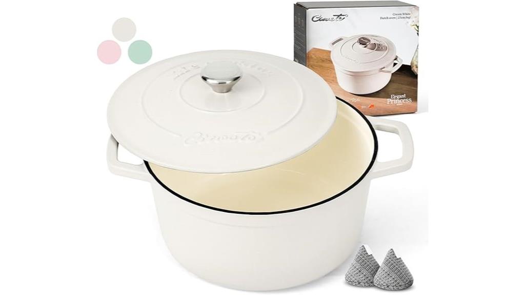 A 6-quart enameled cast iron Dutch oven with a lid offers the perfect blend of durability and versatility for home cooks who want reliable performance across various cooking methods. The Ciwete model features a stylish off-white finish, dual handles, and a cast iron lid, making it both attractive and functional. Its high-quality enamel coating guarantees even heat distribution and easy cleaning, suitable for oven, stove, or outdoor use up to 500°F. Whether braising, baking, or frying, this Dutch oven delivers consistent results. Its sturdy construction and beautiful design make it a practical addition to any kitchen, promising years of trouble-free cooking.