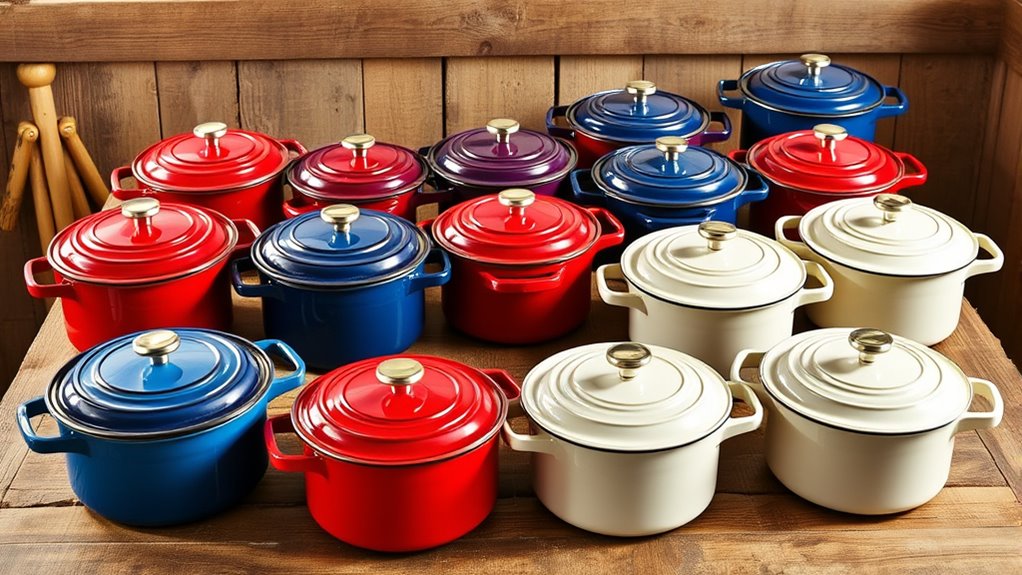 Enameled cast iron coatings offer several advantages that make them a popular choice for 6-quart Dutch ovens. They create a smooth, non-reactive surface that resists staining and corrosion, which helps the pot last longer. Cleaning is easier because the enamel prevents food from sticking, so hand washing with warm water and mild detergent usually suffices. Unlike traditional cast iron, enameled versions don’t require seasoning, meaning you can start cooking right away without extra prep. The glossy finish also adds aesthetic appeal, with vibrant colors that can complement your kitchen decor. When properly cared for, enameled coatings resist rust and chipping, ensuring durability through many cooking cycles. Overall, enamel coatings combine practicality with beauty, making them a convenient and attractive choice.