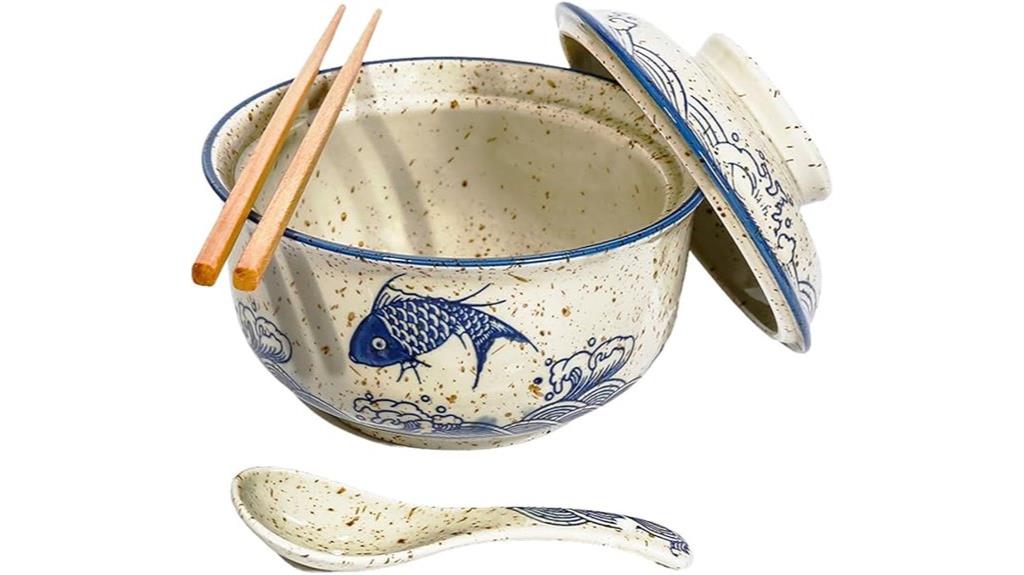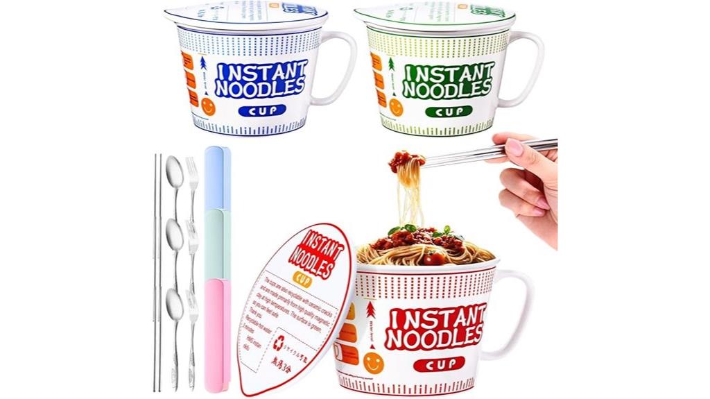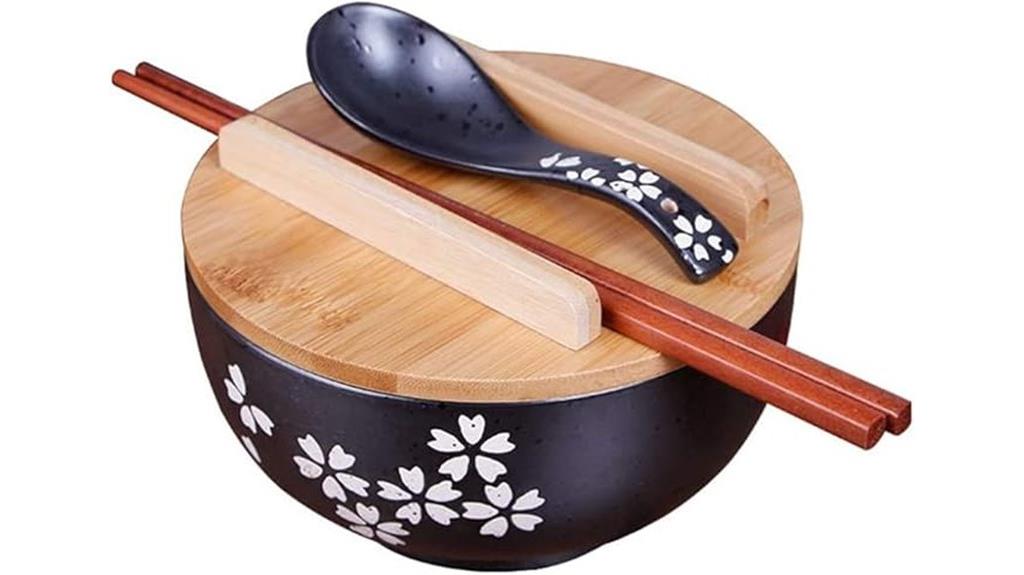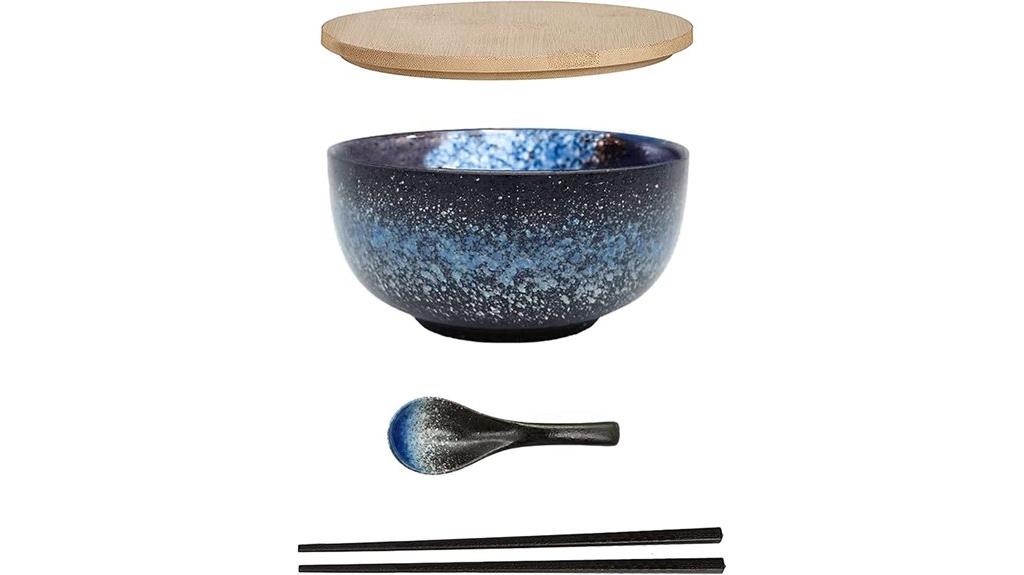 Imagine a sturdy fortress protecting your favorite meal—that’s how durable ceramic ramen bowls with lids can be. I’ve found they’re quite resilient, able to withstand everyday use with proper care. While they might chip or crack if dropped, their thick walls often endure regular handling and microwave heating. I’d say they’re reliable companions for your ramen adventures, offering both style and strength for everyday dining.