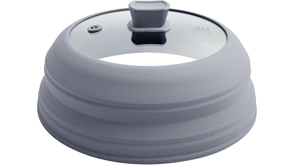 A collapsible microwave food cover is ideal for anyone looking to keep their microwave clean while reheating or cooking leftovers. Made from tempered glass and silicone, it’s durable, heat-resistant up to 450°F, and BPA-free. The see-through glass top lets me monitor food without removing the lid, while 98 vents, including side steam vents, prevent sogginess and promote even heating. Its collapsible design makes storage simple, and the magnetic closure keeps it secure during use. Many users find it reduces messes and simplifies cleanup, though I handle it carefully, as the glass can get hot. Overall, it’s a practical, safety-conscious choice for everyday microwave use.