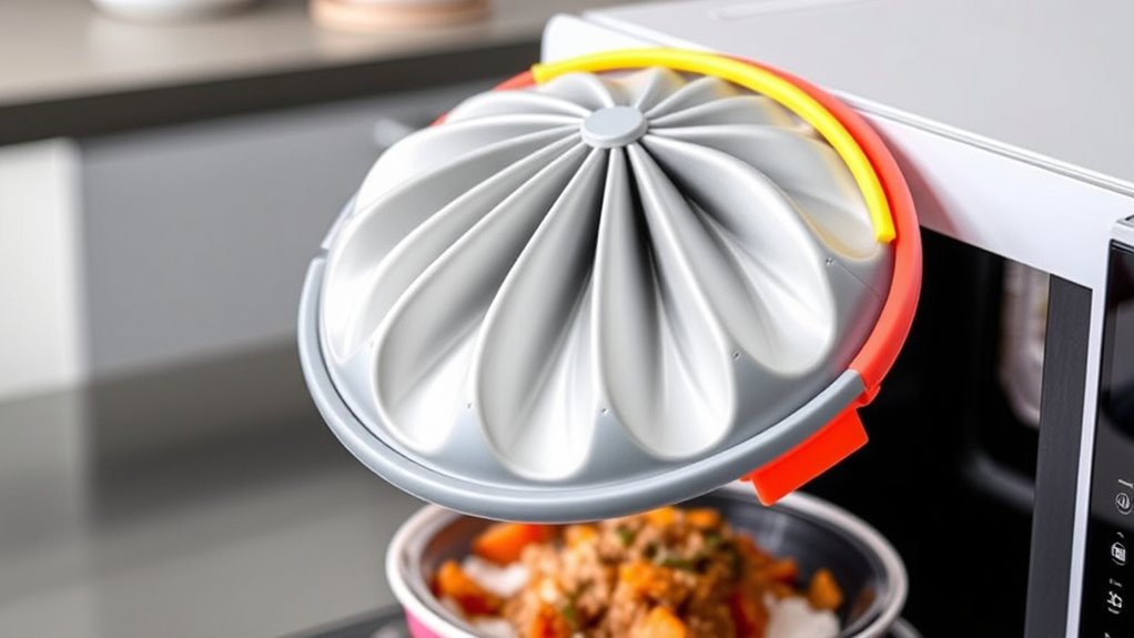 Imagine a gentle shield softly draping over your steaming leftovers—that’s how collapsible covers work. They act like a quiet barrier, catching splatters before they escape, keeping your microwave tidy. By trapping steam and moisture, they minimize splashes and messes. Their flexible design molds to different dishes, making cleanup easier. So, with a collapsible cover in place, your microwave stays cleaner, and your cooking experience becomes hassle-free and more enjoyable.