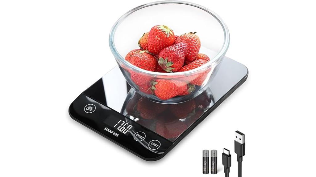 If you’re looking for a reliable and stylish kitchen scale that can handle both small and large ingredients, the BakFee BK-807 is an excellent choice. It features a large 33lb (15kg) capacity with high precision, measuring down to 1g. The tempered glass surface resists scratches and spills, making cleaning easy. Its compact, lightweight design (14.4 ounces) and sleek black finish fit seamlessly into any kitchen. The scale offers multiple units, including grams, ounces, and milliliters, perfect for varied recipes. Plus, it has a rechargeable battery, USB charging, and auto-shutdown, ensuring long-lasting, convenient use without frequent battery replacements.
