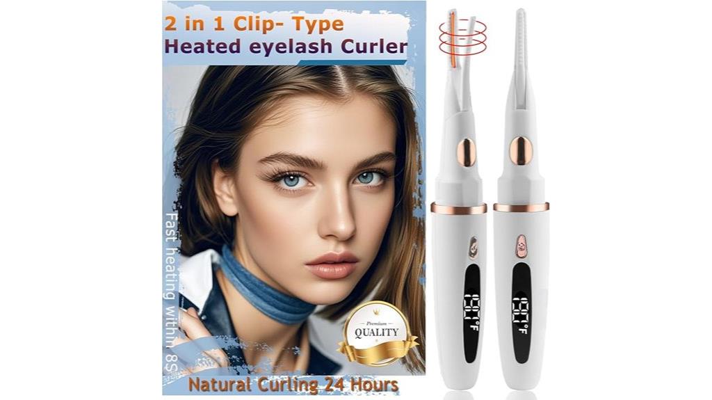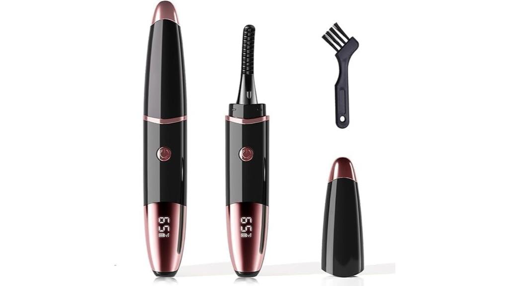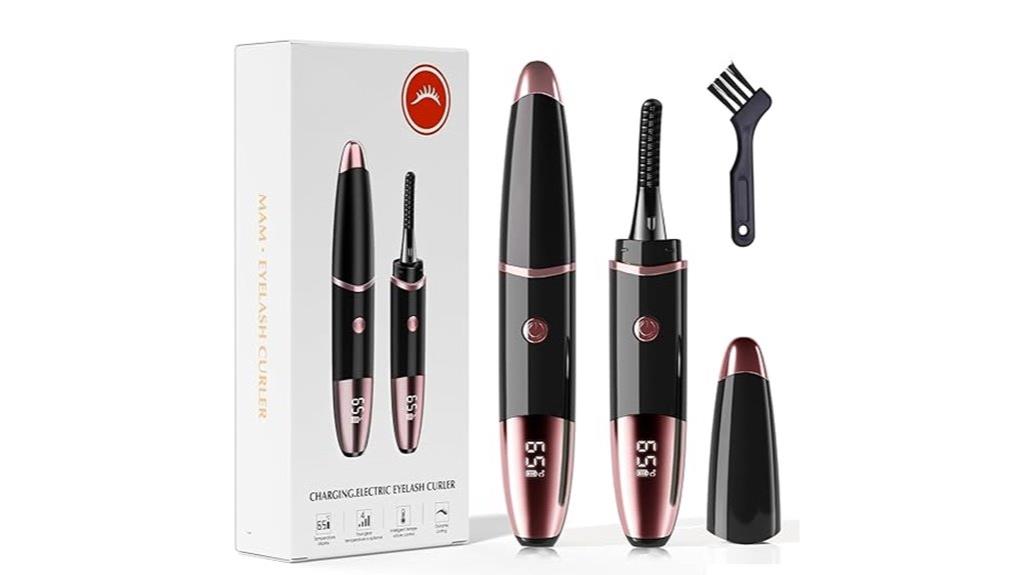 If you want precise control over your eyelash curling routine, heated eyelash curlers with LED displays are ideal. They heat up quickly, reaching the perfect temperature in under a minute, with four adjustable heat settings (65°C to 95°C) you can easily customize. The LED display makes it simple to select and monitor your preferred temperature, ensuring excellent results for different lash types. Compact and lightweight, these curlers fit easily in your makeup bag, making them perfect for travel. With safety features like auto shut-off and rechargeable convenience via Type-C, they offer a reliable, long-lasting curl that lasts up to 24 hours.