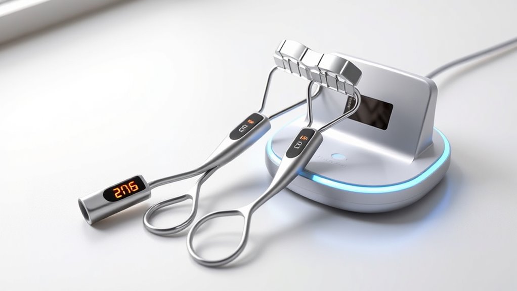 Choosing an electric heated eyelash curler with multiple temperature adjustment options is essential because it allows me to tailor the heat level to my lash type and desired curl. With adjustable settings, I can select the perfect temperature to prevent damage and achieve natural, long-lasting curls. Many devices feature digital displays or indicator lights, making it easy to monitor and switch between heat levels. Having a range of options, usually from about 50°C to 95°C, helps me customize the heat for delicate lashes or stubborn, straight lashes. Precise control over temperature ensures I avoid overexposure, reducing the risk of lash damage. Overall, these options give me confidence that I can achieve the desired curl while keeping my lashes healthy and protected.