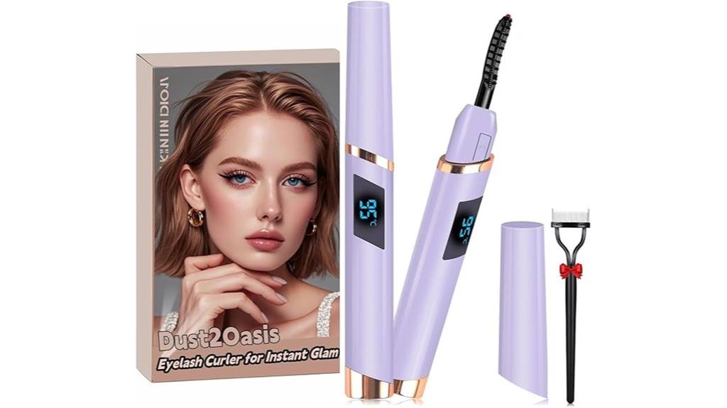 Heated eyelash curlers with LED display are perfect for beauty enthusiasts who value precise control and quick results. I love how the LED screen shows three adjustable temperatures—65°C, 85°C, and 95°C—so I can customize the heat for my lashes. The ergonomic 15° curved head fits my lash shape perfectly, and the safety features prevent burns. With rapid heating in just 10-30 seconds and a USB rechargeable battery, I can style my lashes anytime, anywhere. The compact design makes it ideal for travel. Plus, the clear display and multiple lash combs help me achieve natural, long-lasting curls effortlessly.