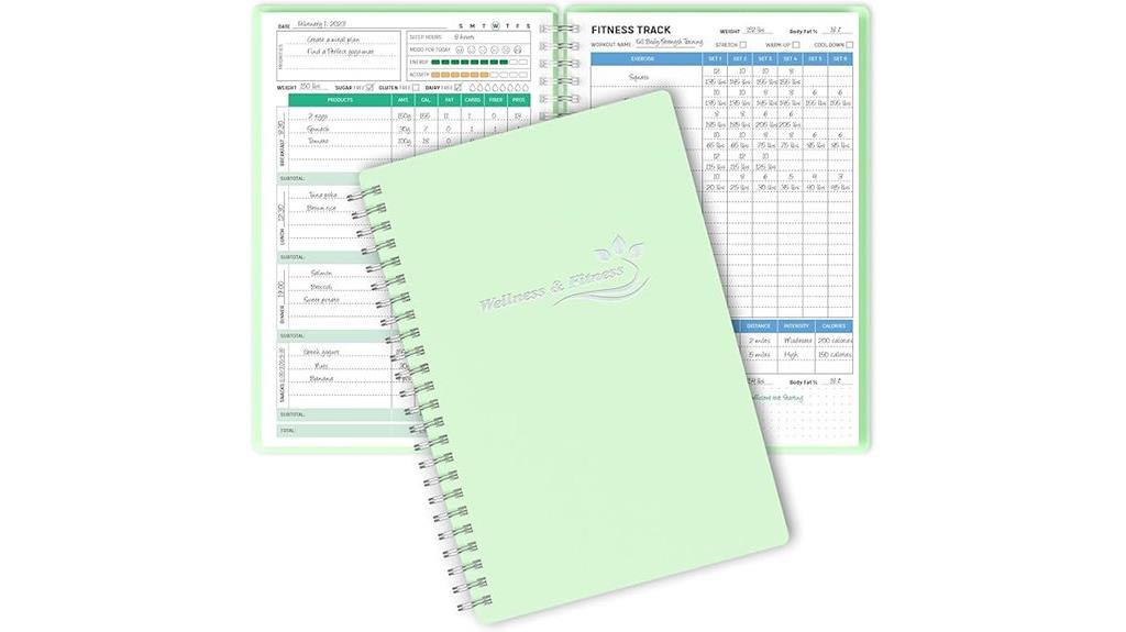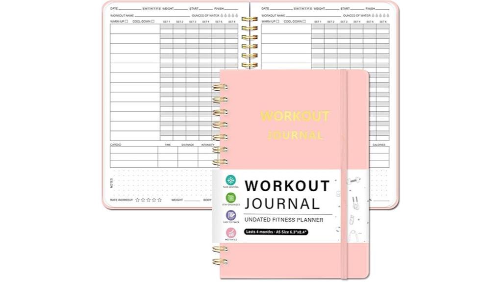 Like a sturdy shield in a battle, hardcover undated fitness journals are remarkably durable. I’ve found they withstand daily wear and tear—whether tossed in gym bags or left on desks—thanks to their robust covers and quality binding. This resilience keeps your progress safe and intact, inspiring confidence every time you open them. If you’re seeking a reliable companion for your fitness journey, a hardcover journal is definitely worth considering.