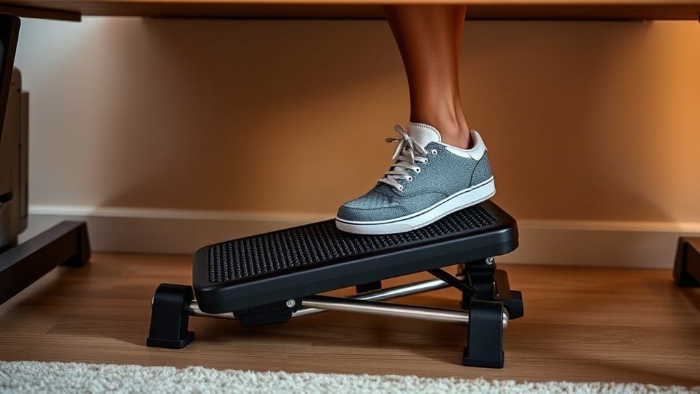 When choosing a mini stepper under your desk, ease of use is crucial for maintaining a consistent workout routine. I look for models that are simple to assemble and require minimal setup. Intuitive controls, like straightforward resistance adjustments or digital displays, make tracking progress easy. Clear monitoring tools such as LCD screens that show steps, calories, and workout time enhance user friendliness. Adjustable resistance and stride height should have accessible knobs or buttons for quick changes without fuss. Lightweight and compact designs help me move and store the machine effortlessly. Features like anti-slip pedals, a stable base, and quiet operation—around 25 dB—ensure my workouts are convenient and unobtrusive. Prioritizing ease of use keeps me motivated and engaged during every session.