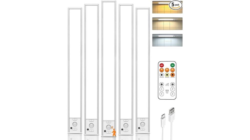 The 16-inch LED under cabinet lights with remote control are perfect for anyone seeking versatile, easy-to-install lighting solutions for multiple indoor spaces. This 5-pack offers sleek, modern fixtures made of aluminum and plastic, with waterproof design and magnetic or adhesive mounting—no electrician needed. Each light delivers 500 lumens with adjustable brightness and three color options, controlled remotely within 16 feet. Powered by rechargeable 4000mAh batteries, they last up to 70 days on auto mode. Their motion sensors activate lights within 10 feet, and the remote allows easy control of brightness, modes, and timers, making them ideal for kitchens, closets, or workshops.