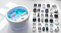 Choosing a compatible power source for your rechargeable under-cabinet lights is essential to guarantee reliable and convenient operation. First, confirm the lights support your preferred charging method, like USB-C or micro-USB, for easy access. Check the battery capacity (mAh) to ensure it matches your usage needs—higher ratings mean longer runtime between charges. It’s also helpful if the lights support multiple power sources, such as power banks or wall adapters, giving you flexibility. Consider the battery type, like lithium-ion or lithium-polymer, based on durability and safety preferences. Finally, see if the system offers backup power options or can operate while charging, ensuring continuous illumination during power outages or extended use. This compatibility guarantees seamless, reliable lighting whenever you need it.