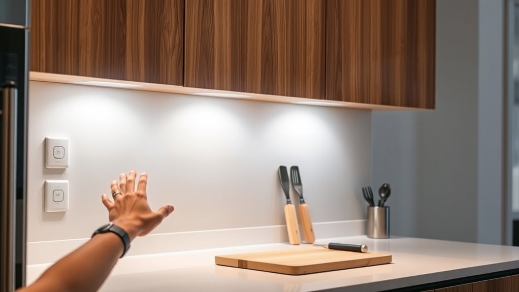 Have you ever wondered how far your under-cabinet light’s motion sensor can detect movement? Typically, the detection range varies from 8 to 16 feet, depending on the model. A wider sensing angle, often 120°, helps cover more area and reduces blind spots. Longer ranges can boost convenience, but they might cause accidental activations from distant movements, which can be frustrating. Luckily, some lights feature adjustable range settings, allowing you to customize the detection distance to fit your space and preferences. Keep in mind, a shorter sensor range can improve energy efficiency by preventing unnecessary activation, helping conserve battery life. Choosing the right range depends on your specific needs for coverage and convenience in your space.