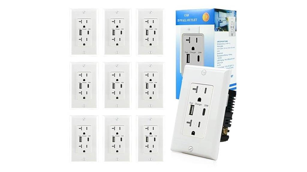 When upgrading multiple rooms or spaces, the Pack LGL USB C Charger Wall Outlets offer an ideal solution with their 20W fast charging capabilities and versatile design. This 10-pack includes outlets with both USB A and USB C ports, supporting quick 20W charging for phones, tablets, and more. They feature two traditional 20Amp outlets, side and back wiring options, and come with a wall plate compatible with standard boxes. Certified by ETL and tamper-resistant, they guarantee safety for families. Easy to install, these outlets are perfect for modern homes needing reliable, high-speed charging in multiple locations.