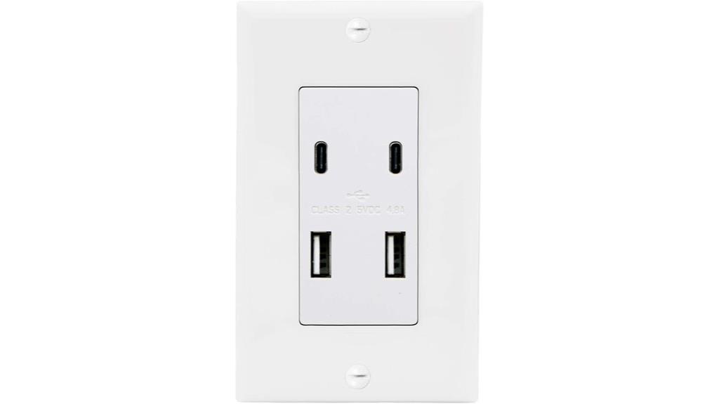 A sleek and modern design can greatly enhance the overall look of your space, so it’s essential to choose USB wall outlets that complement your home decor. Look for outlets with a clean finish and contemporary style to create a seamless appearance. Integrated features like tamper-resistant shutters should blend into the background while still providing safety. Opt for outlets with a low-profile or slim profile to prevent them from protruding and disrupting the room’s aesthetic. Matching or neutral-colored wall plates help maintain visual consistency with your existing decor. Additionally, select outlets with minimal visible wiring or bulky circuitry to keep your space tidy and streamlined. Prioritizing these design elements ensures your high-speed charging setup is both functional and visually appealing.