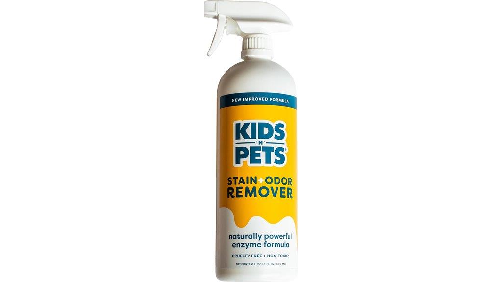 KIDS N PETS All-Purpose Stain & Odor Remover stands out as an ideal choice for households with children and pets because it’s non-toxic, safe, and enzyme-based. I’ve used it on carpet, furniture, and clothing, and it works effectively to neutralize pet urine, vomit, and household odors. Its enzyme formula not only removes smells but also prevents future accidents by deterring repeat stains. I appreciate its safe, pleasant scent and versatility—perfect for cleaning up kid and pet messes alike. Plus, it’s cruelty-free, leak-proof, and refillable, making it a cost-effective, reliable solution for maintaining a fresh, clean home.
