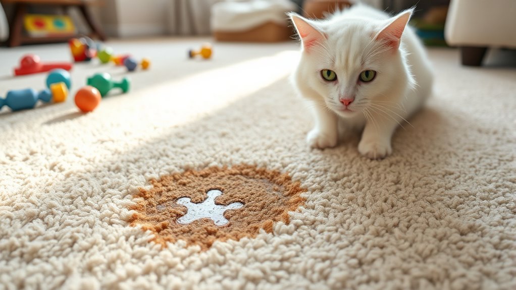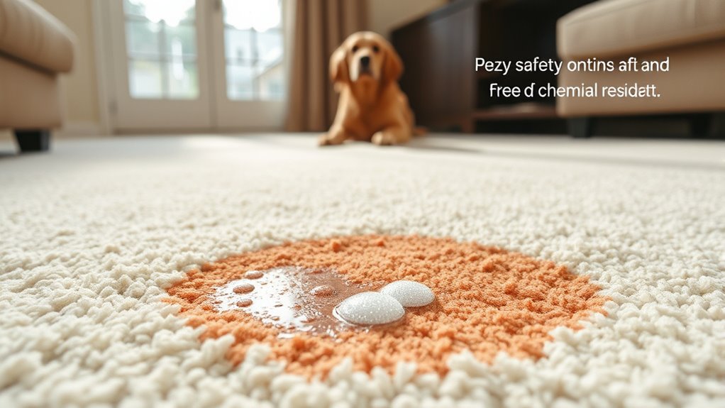 Ensuring a carpet stain remover is truly pet-safe starts with checking for reputable certifications. Look for labels from trusted organizations like the Carpet and Rug Institute (CRI), which test products for safety and performance. Certified pet-safe cleaners have undergone testing to confirm they don’t contain hazardous chemicals or toxins harmful to animals. Many certifications require products to be free from chlorine, ammonia, bleach, and volatile organic compounds (VOCs). These labels help verify that the product is non-toxic and safe for use around pets when used as directed. Always scan the packaging for specific pet safety symbols or seals to guarantee the enzymatic cleaner is approved for pet-friendly environments. Certifications provide peace of mind that your choice is both effective and safe for your furry friends.
