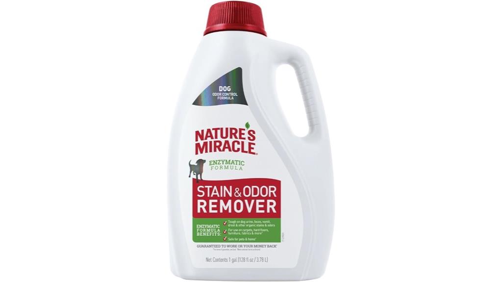 If you’re looking for a reliable, pet-safe solution to eliminate stubborn stains and odors, Nature’s Miracle Dog Stain and Odor Eliminator Spray stands out as an excellent choice. With over 35 years of experience, this trusted brand effectively tackles severe pet messes like urine, vomit, and diarrhea. Its enzymatic formula breaks down organic stains at the source, eliminating odors and discouraging re-soiling. Safe on carpets, furniture, and fabrics (excluding delicate surfaces), it’s simple to use—just spray, wait 10 minutes, then blot. While the scent can be strong initially, it dissipates as the area dries, leaving your home smelling fresh and clean.