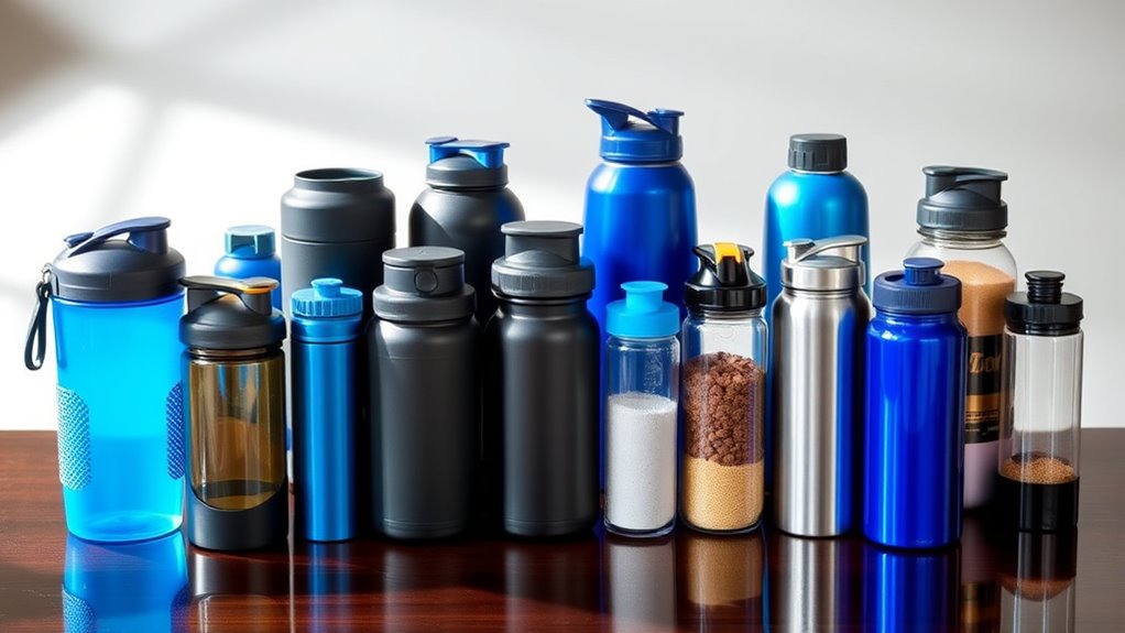 If you’re looking for the best protein shaker bottles with storage, I’ve found options that are stylish, functional, and built for active lifestyles. They come in various sizes, feature leak-proof lids, and often include compartments for pills or powders. Many are dishwasher safe and made from safe, durable materials like Tritan or stainless steel. With innovative mixing systems, these bottles ensure smooth shakes every time. Keep exploring further to discover the top picks perfect for your workout needs.