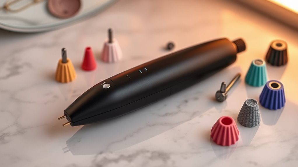 Choosing the right rechargeable electric nail file hinges on its compatibility with standard drill bits, typically 3/32-inch shank size, which guarantees you can use a wide range of attachments. Make sure the device includes various drill bits and sanding bands suitable for shaping, polishing, and cuticle removal. It’s also essential to verify that replacement accessories are easy to find and compatible with your model to ensure long-term usability. Look for a twist-lock or quick-change system, which makes swapping bits simple and secure during your manicure or pedicure. Additionally, consider the variety of included accessories, such as carbide, ceramic, or diamond bits, to match your specific needs. Compatibility and a good selection of accessories streamline your routine and enhance your overall nail care experience.