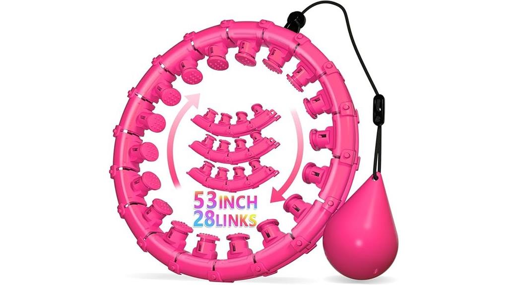 If you’re new to hula hooping or seeking a customizable workout option, the Weighted Hula Fitness Hoop with 28 links and a 53-inch diameter is an excellent choice. Its adjustable design lets you customize the fit from 17 to 53 inches, making it perfect for beginners, teens, and adults. Made from durable ABS plastic, it’s built to withstand daily use. The 28 detachable knots with massage nodes promote blood circulation and waist relaxation. Easy to assemble and secure, it stays in place during workouts. With a lightweight design and user-friendly features, this hoop offers an effective, fun way to burn calories and tone your core at home.