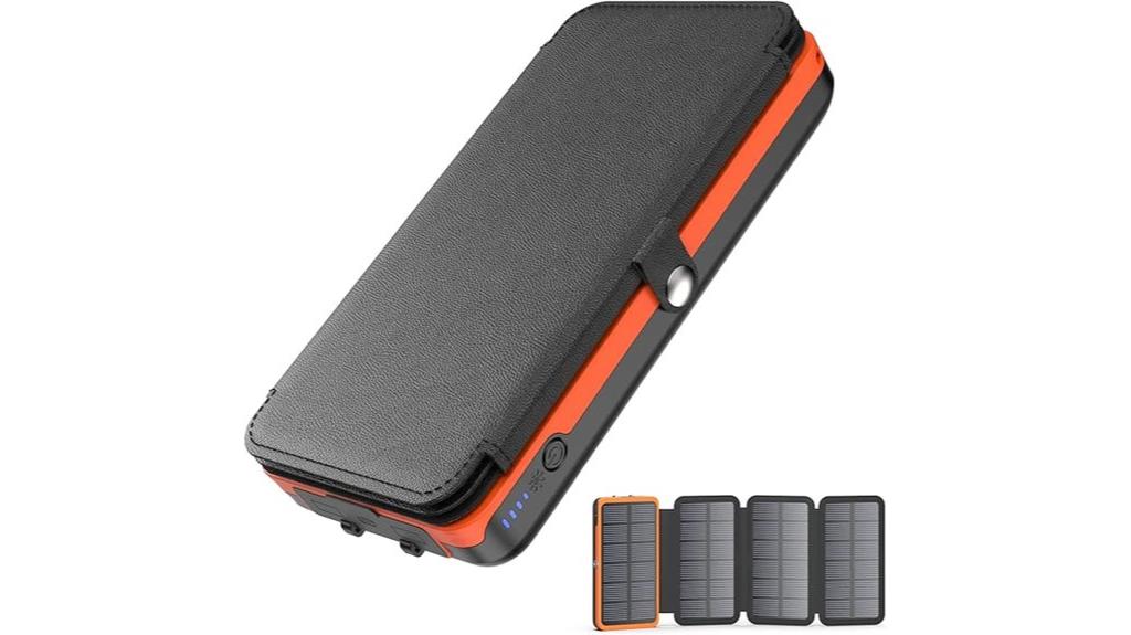 The BLAVOR Solar Charger Power Bank with four foldable panels stands out as an excellent choice for outdoor enthusiasts who need reliable power in remote settings. With a 20,000mAh capacity and rugged, waterproof design, it’s built for tough outdoor conditions. Its four solar panels generate up to 1.2A under intense sunlight, notably boosting charging speed. Compact and portable, it includes useful features like a camping flashlight, compass, and multiple ports—USB-A, USB-C, and quick-charge support—making it versatile for various devices. Whether camping or facing emergencies, this power bank provides dependable, eco-friendly energy whenever you need it.