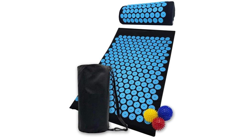 Selecting a spike massage mat that fits your space and lifestyle starts with considering its size and portability. I look at the dimensions to guarantee it covers the target area effectively, whether for full back relief or targeted points. Weight and foldability are key—lighter mats are easier to carry and store, especially if I plan to use them in multiple locations. A carrying case or bag is a bonus, protecting the mat during travel and making transportation more convenient. Smaller or lightweight mats tend to be more portable but might not provide full-body coverage. Alternatively, multi-piece sets with compact sizes offer versatility for both targeted and full-body acupressure, ideal for those who want flexibility on the go.
