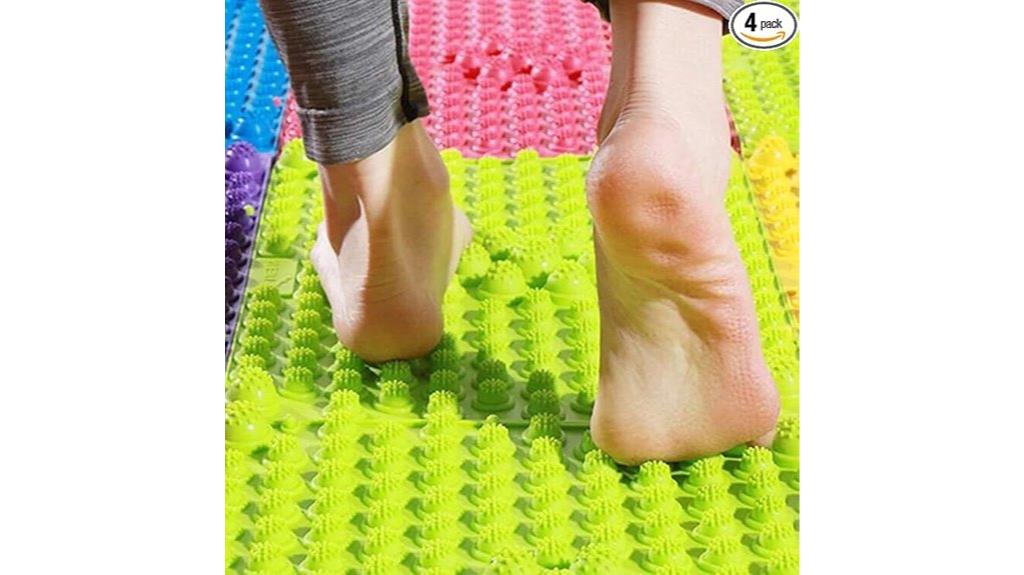 The density and sharpness of spikes on a massage mat are essential factors that directly impact your acupressure experience. Higher spike density provides more stimulation points, creating a more intense and potentially more effective pain relief. However, sharper spikes can penetrate deeper into the skin, offering targeted pressure but also increasing the risk of discomfort or skin irritation if not used carefully. Many mats feature adjustable spike density, allowing you to customize the intensity based on your sensitivity or experience level. The number of spikes varies widely, with some mats boasting over 11,000 points, influencing coverage and overall sensation. Balancing spike sharpness is vital—sharp enough to stimulate deeply but not so sharp that they cause injury, especially during prolonged use.
