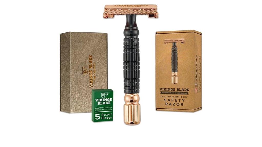 For those seeking a blend of craftsmanship and style in their shaving routine, the VIKINGS BLADE Double Edge Safety Razor with Blades and Case stands out as an ideal starter kit. Made from durable brass and bronze alloy, it offers a sturdy, elegant design with a rose-gold and black finish that looks great on display. The butterfly opening mechanism makes blade changes quick and easy, while the textured handle provides a secure grip. Included are five platinum-coated Swedish steel blades and a luxury case, making it a complete, attractive set. This razor delivers a smooth, controlled shave that reduces irritation, perfect for those shifting from cartridge razors.
