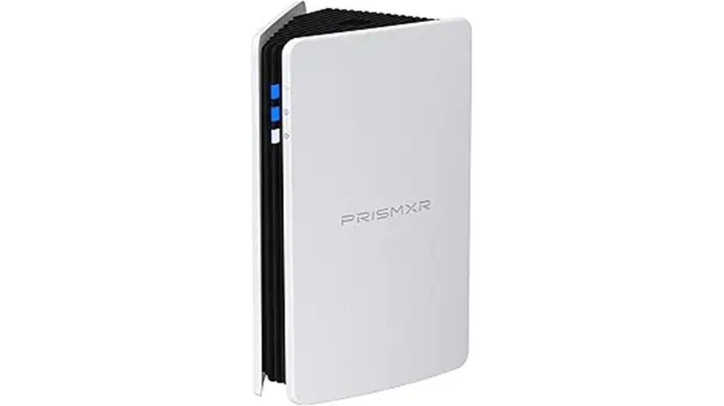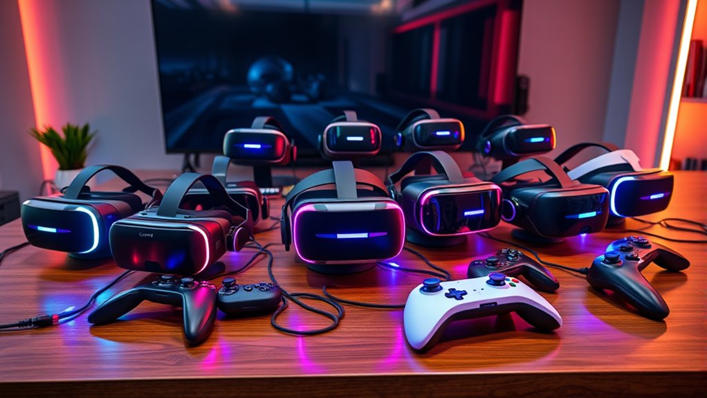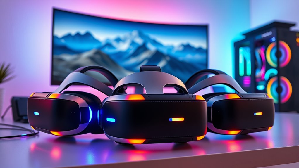 High visual clarity is key to getting the most out of your PC-compatible VR headset. Look for high-resolution displays like 8K or 5K to minimize pixelation and screen door effects, guaranteeing sharper images. A wider field of view, ideally 110° or more, enhances immersion by providing a natural, panoramic view. Advanced display technologies such as OLED or QLED deliver deeper blacks, brighter colors, and better contrast, which boost visual crispness. Features like local dimming and high pixel density (PPI) further sharpen images. Additionally, adjustable IPD settings help align lenses for peak focus, reducing eye strain. Prioritizing these standards ensures a more immersive, vivid experience that truly captures every detail of your virtual environment.
